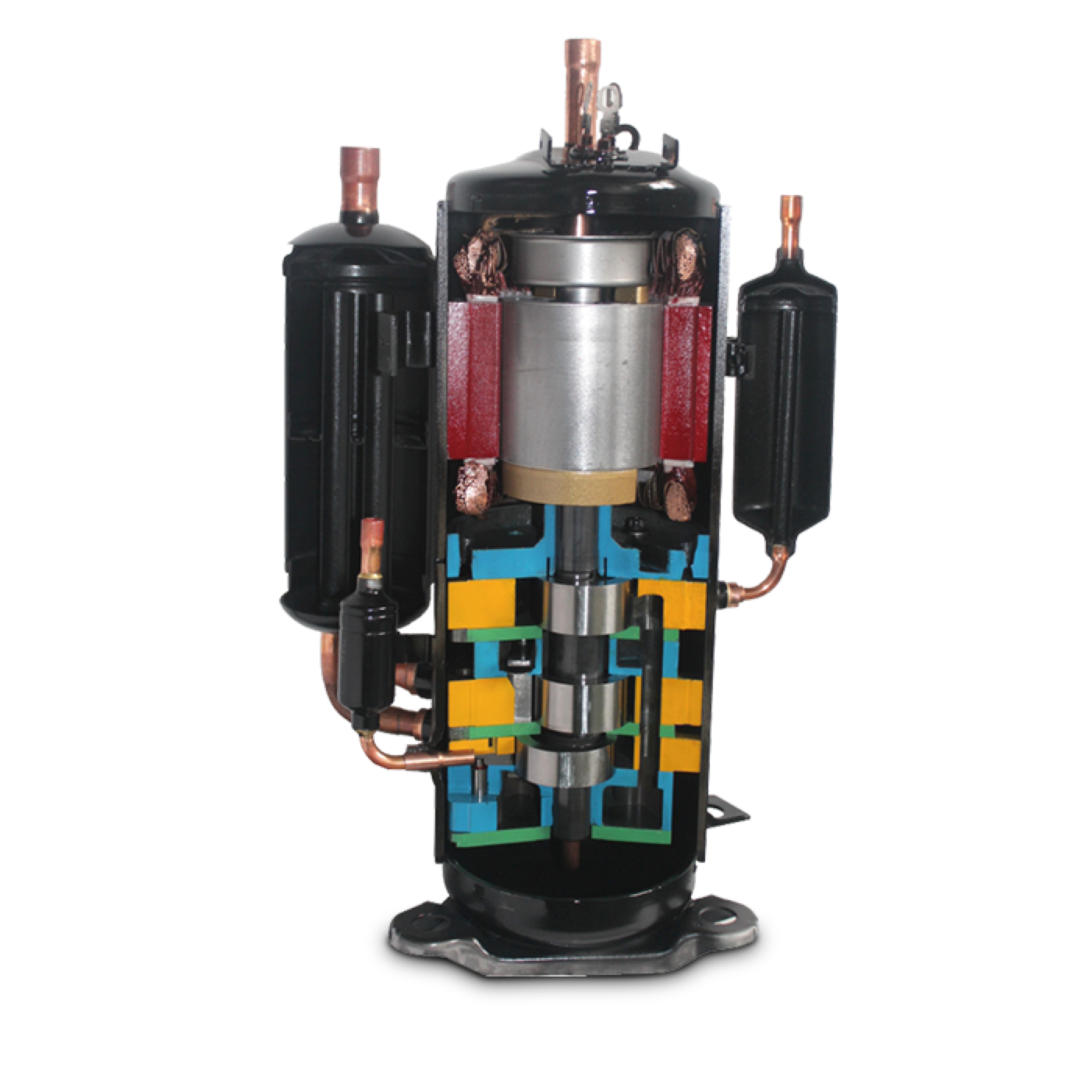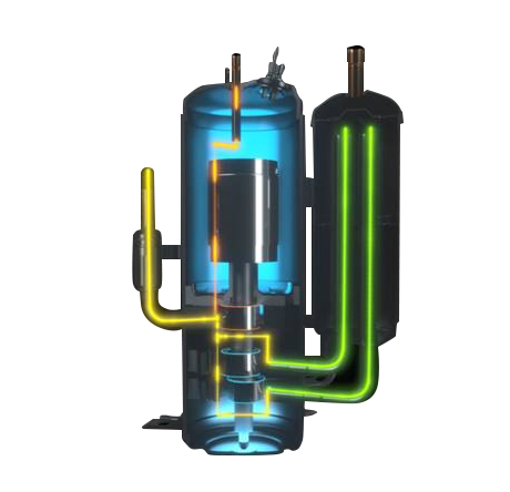 三缸雙級變?nèi)莘e比壓縮機(jī)可實現(xiàn)兩種不同容積比的雙級壓縮,可降低單個氣缸的壓縮比,減小了泄漏量,提高了壓縮機(jī)的容積效率,與單級壓縮系統(tǒng)相比,雙級增焓壓縮系統(tǒng)具有能力高、能效高和可靠性高的優(yōu)勢,使用在家用熱泵空調(diào)、多聯(lián)式熱泵空調(diào)、戶用冷水熱泵機(jī)組等多種類型的熱泵產(chǎn)品中。