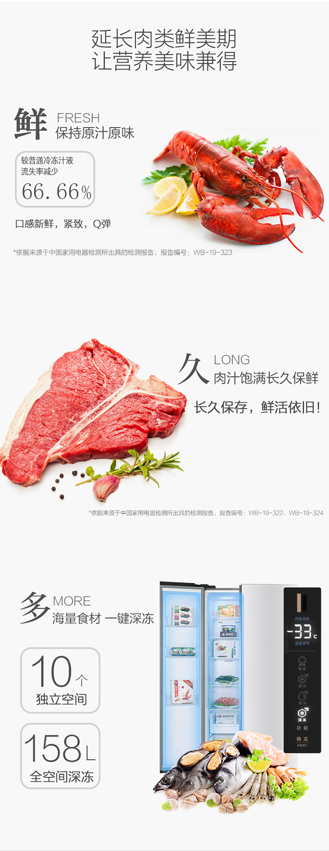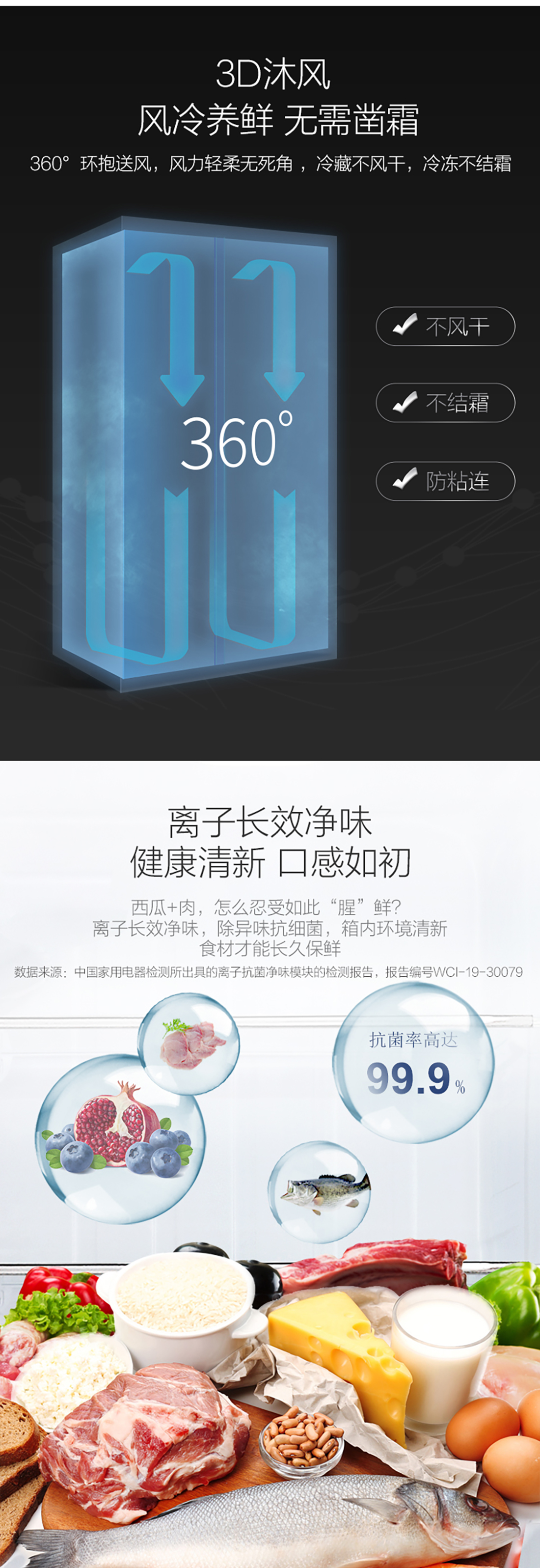 搭載-33℃深凍鎖鮮科技,肉汁飽滿更長久。采用離子長效抗菌凈味,抗菌率高達99.9%。3D沐風,風冷養(yǎng)鮮,無需鑿霜。